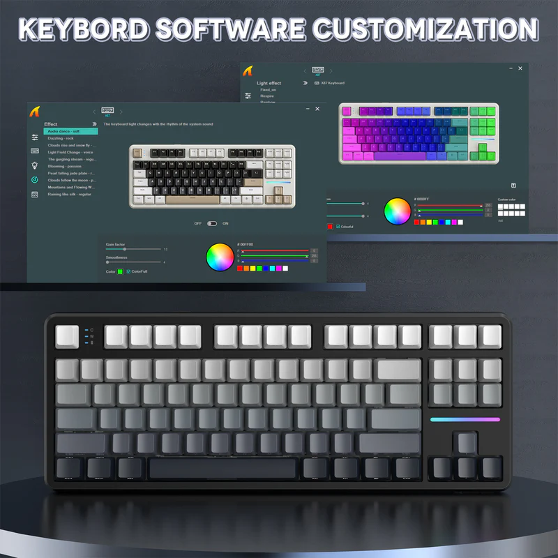 Tri-Mode Connectivity: Supports USB-C wired, Bluetooth 5.0, and 2.4GHz wireless modes for maximum flexibility. Hot-Swappable Switches: Compatible with both 3-pin and 5-pin mechanical switches; easily swap without soldering. Gasket-Mounted Structure: Offers a soft, quiet, and cushioned typing experience with reduced vibration. Five-Layer Acoustic Dampening: Multiple sound-absorbing layers ensure a quieter, more satisfying keystroke. Pre-Lubed Linear Switches: Smooth and responsive switches enhance both typing and gaming performance. RGB Backlighting: South-facing LEDs with 16.8 million colors and 18+ lighting modes, customizable via software or shortcuts. PBT Double-Shot Keycaps: Durable, shine-resistant keycaps with side-printed legends for a clean look. Ergonomic Design: Two-stage adjustable feet and a compact layout help maintain a comfortable posture during extended use. 4000mAh Rechargeable Battery: Large battery with intelligent power-saving ensures long-lasting wireless usage. Software Support: Fully programmable with custom key mappings, macros, and lighting profiles.