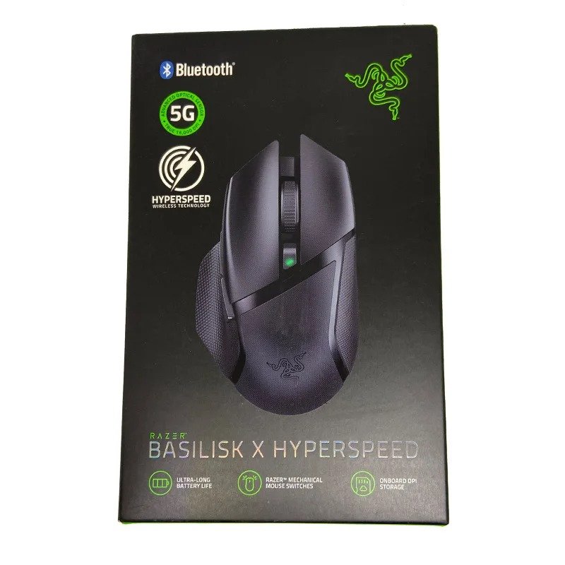 he Razer Basilisk X Hyperspeed isa wireless gaming mouse offering both Razer™ HyperSpeed Wireless and Bluetooth connectivity for versatile use. It features a 16,000 DPI 5G Advanced Optical Sensor, Razer™ Mechanical Mouse Switches, and up to 285 hours of performance in HyperSpeed Wireless or 450 hours in Bluetooth mode. The mouse also includes 6 programmable buttons, allowing for customization through Razer Synapse software, and offers an ergonomic right-handed design.